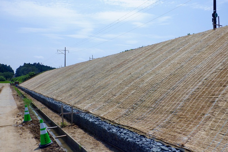 ◇法尻にかご枠を設置し法面崩壊を防ぎます。法面を保護するためにわら芝を敷設しました。